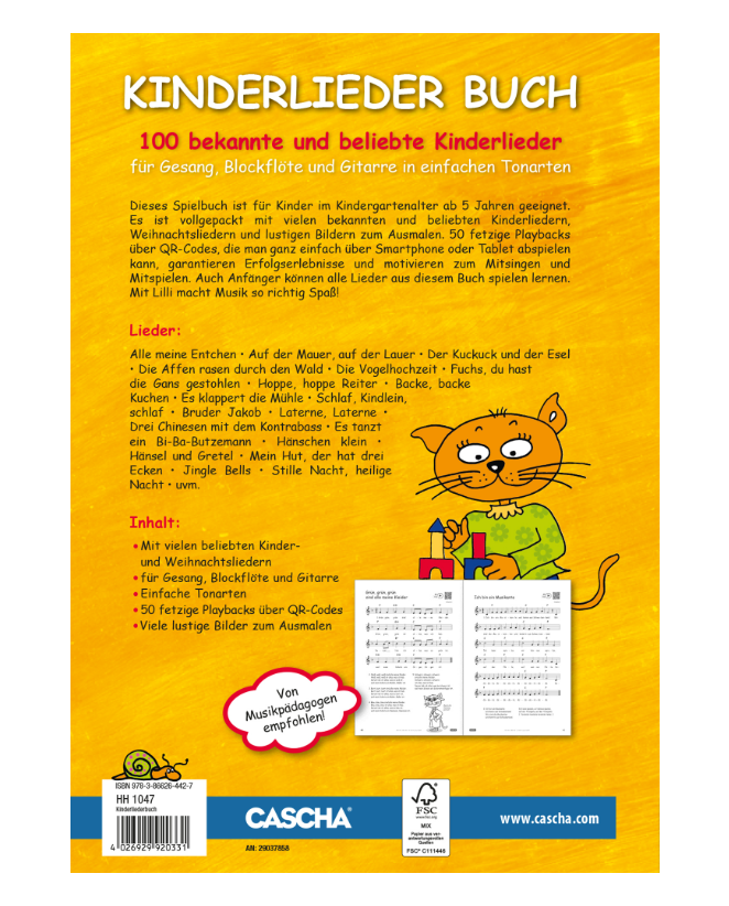 100 bekannte und beliebte Kinderlieder für Gesang, Blockflöte und Gitarre in einfachen Tonarten. Dieses Spielbuch ist für Kinder im Kindergartenalter ab 5 Jahren geeignet. Es ist vollgepackt mit vielen bekannten und beliebten Kinderliedern, Weihnachts-liedern und lustigen Bildern zum Ausmalen.Über QR-Code garantieren 50 fetzige Playbacks Erfolgserlebnisse und motivieren zum Mitsingen. Auch Anfänger können alle Lieder aus diesem Buch spielen lernen. Mit Lilli macht Musik so richtig Spaß!